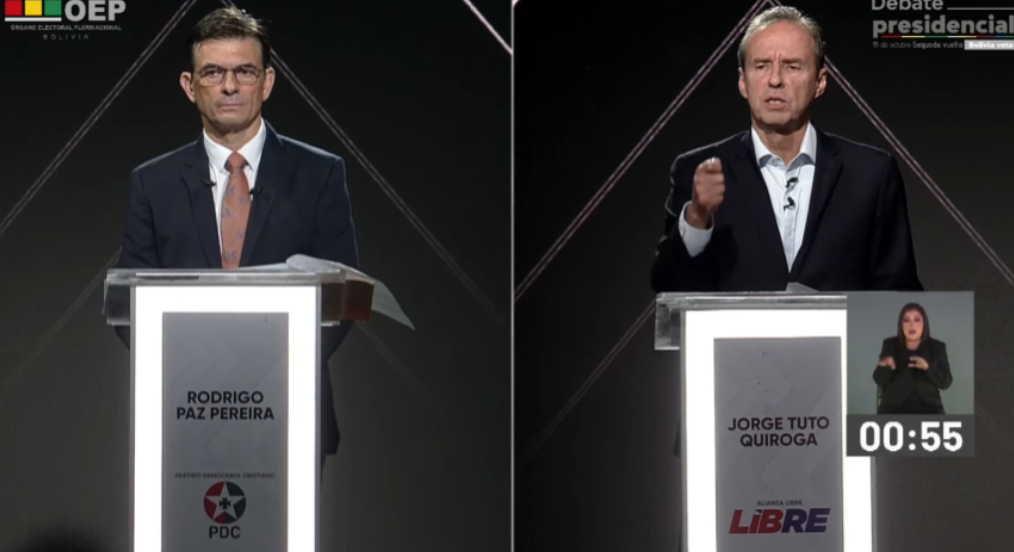 El candidato presidencial del Partido Demócrata Cristiano (PDC), Rodrigo Paz, aprovechó sus últimos minutos del debate para invitar a la población a votar libre. Su par de la alianza Libre, Jorge Tuto Quiroga, agradeció el apoyo. “El 19 de octubre no podemos abandonar a la patria, vaya a votar, vote libre. Vote por el que usted quiera, pero vote, genere un cambio, una transformación”, dijo Paz al finalizar el debate. .Las redes sociales no dejaron escapar esa referencia y comenzó a viralizarse ese momento de su discurso. Su contendor también aprovechó la frase de su contendor para reforzar su campaña y alentar a los simpatizantes del otro frente a votar por Libre. “En lugar de hacer uso de mis dos minutos para mi cierre, estuve a punto de decir: ya lo dijo todo Rodrigo, vote libre. Estaba bien, se le agradece. Aquellos que estaban por ese lado, escúchenlo, vote Libre. Yo les pido a todos los bolivianos vote Libre este 19 de octubre y vamos a cambiar Bolivia para siempre”, dijo Quiroga en la conferencia de prensa luego del debate presidencial. Paz salió a aclarar que no invitó a votar por la alianza de su oponente, sino que pidió a la población a votar en libertad el siguiente 19 de octubre. “Quiero hacer una aclaración, tanto Edmand como yo, hemos sufrido mucho ataque mediático, mucha deformación. Cuando dije con toda claridad, vote libre, es por la libertad. La libertad no tiene propietarios y menos en Bolivia”, explicó el candidato del PDC. ANF