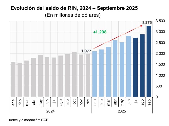 Al respecto, al 30 de septiembre, las RIN alcanzaron un saldo de $us3.275 millones lo que representa un incremento de $us1.298 millones con relación a diciembre de 2024, resultado que confirma no solo la estabilidad de las reservas, sino el desempeño significativamente positivo en lo que va de la presente gestión.