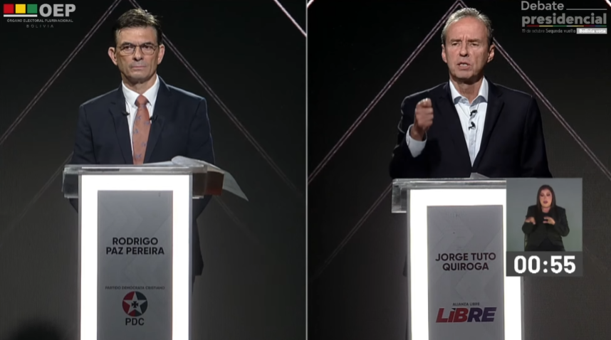 Los candidatos Rodrigo Paz (PDC) y Jorge “Tuto” Quiroga (Libre 21) participaron este domingo en el debate presidencial organizado por el TSE, rumbo al histórico balotaje del 19 de octubre. El encuentro abordó seis ejes temáticos con propuestas, dúplicas y réplicas. A momentos, la tensión subió al incluir referencias personales y familiares.
