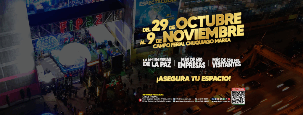 Del 29 de octubre al 9 de noviembre, el Campo Ferial Chuquiago Marka será el escenario de la Feria Internacional de La Paz (FIPAZ) 2025, que reunirá a 650 expositores en cinco pabellones con actividades para toda la familia, desde juegos extremos hasta una casa del terror.
